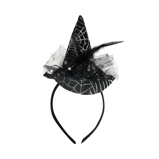 Stylová čelenka je perfektním doplňkem na večírek nebo Halloween párty! Černá čelenka je doplněna mini kloboučkem s dekorem pavučinky a tylovou ozdobou s peřím.