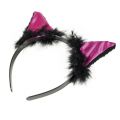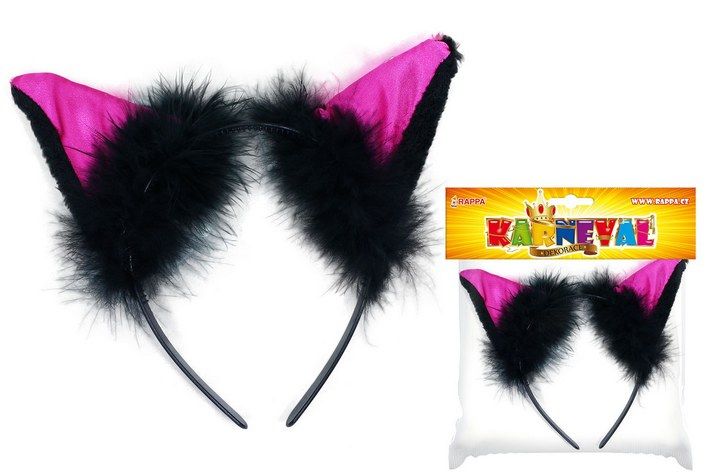 Karnevalová čelenka s kočičíma ušima růžovo-černé barvy a peřím je perfektním doplňkem ke kostýmu kočky.