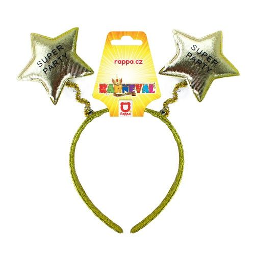 Karnevalová čelenka ve zlaté barvě je zdobená hvězdičkami s nápisem SUPER PÁRTY. Hvězdy jsou k čelence připevněny pomocí pružinek.