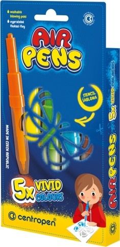 Sada foukacích fixů s vnitřní náplní, které jsou určeny na papír. Náplně obsahují zdravotně nezávadný inkoust, snadno smývatelný a vypratelný. Ventilační chránítko, po použití řádně uzavřít. Balení obsahuje také 1 šablonu.