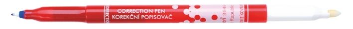 První korektor s trojúhelníkovým držením na obou stranách, dvě funkce v jednom popisovači, jeden hrot zmizíkuje modrý inkoust plnicích per, druhý hrot přepisuje vyzmizíkovanou stopu.