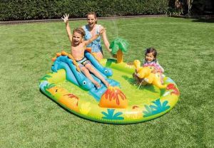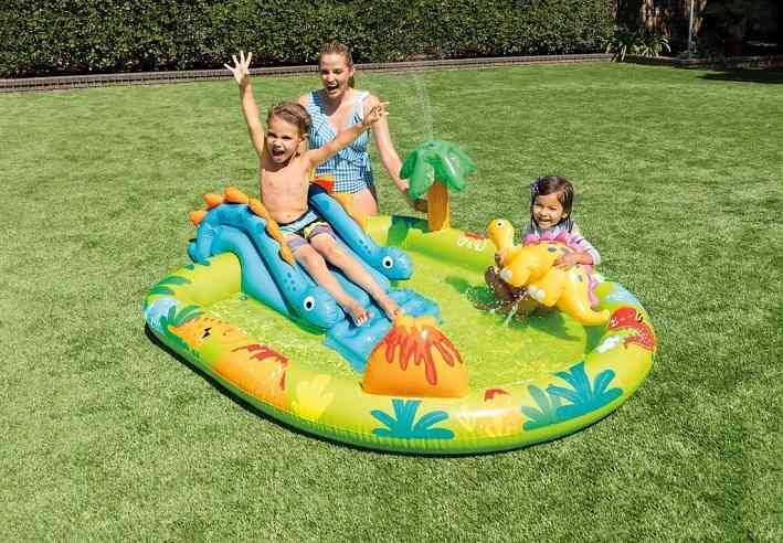 Nafukovací centrum v designu dinosaura o velikosti 1,91 m x 1,52 m x 58 cm. Hubice na vodní rozstřikovač. Výrobek obsahuje skluzavku a další herní prvky. Součástí výrobku je také jedna nafukovací podložka navíc. Vypouštěcí zátka ve dně bazénu. Kapacita bazénku je 143 litrů a výška stěny je 12 cm. Maximální nosnost je 54 kg. Součástí balení je opravná záplata. Vhodné pro děti od 2 let.
