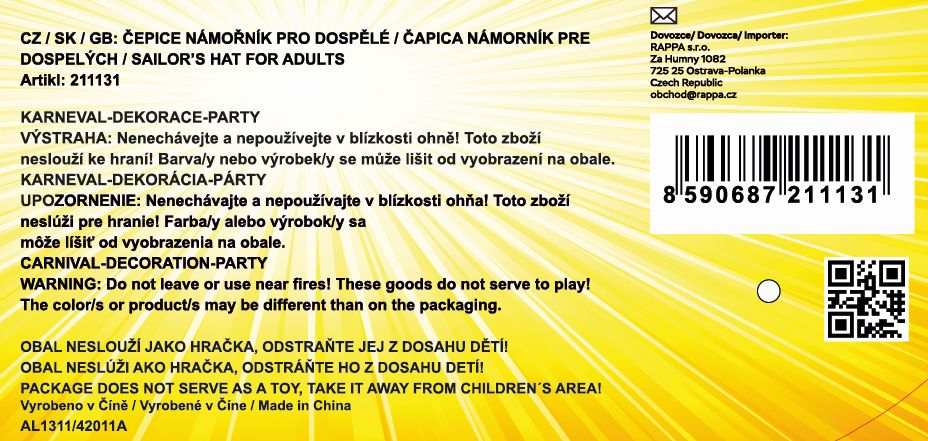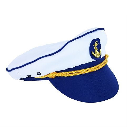 Parádní bílá čepice s modrým kšiltem a lemováním ve stylu námořníka pro dospělé! Tento senzační kousek je zdoben zlatým odznakem na přední straně čepice. Staňte se hvězdou karnevalového večírku díky této nepřehlédnutelné čepici a ohromte tak všechny své přátele!