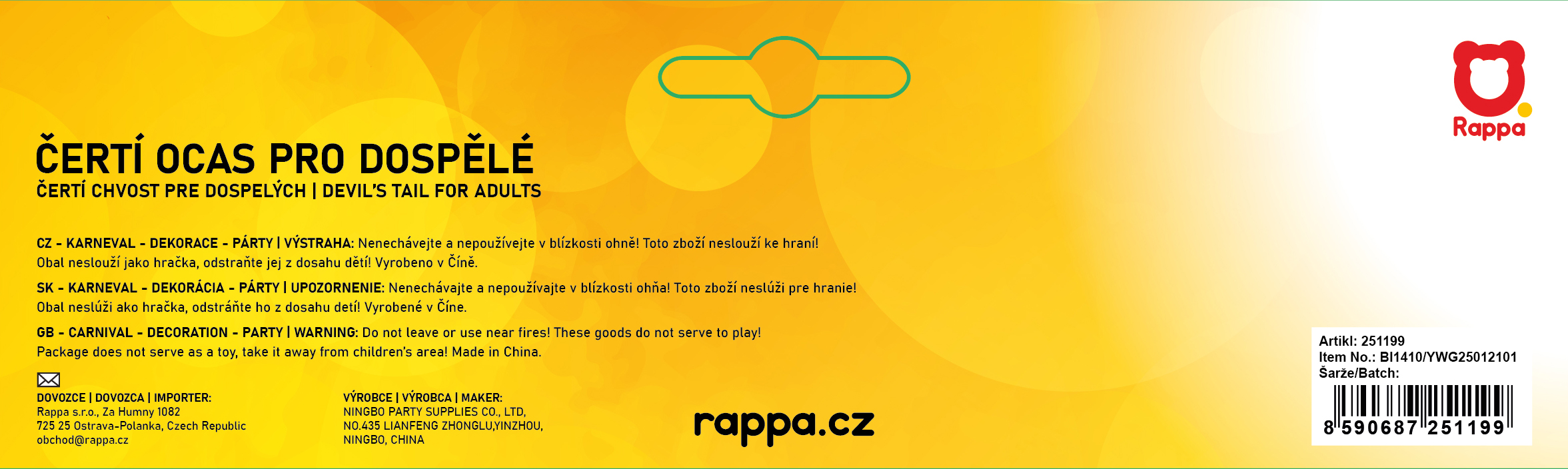 Čertí ocas je nepostradatelný doplněk ke kostýmu čerta! Tento čertí ocas je vyroben z filcu a připevňuje se na gumičku, kterou si dáš kolem pasu. Uvnitř ocasu se nachází drátek, díky kterému můžeš ocas jakkoli tvarovat. Jeho délka je cca 70 cm.
