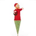 Kornoutový maňásek "3v1" = loutka+maňásek+schránka na drobnosti. Ovládá se dřevěnou tyčkou, kterou také schováte celou postavičku do kornoutu. Otvorem na zádech ovládáte ruce, tak jako u maňásků, nebo vložíte drobné dárky do kornoutu.
