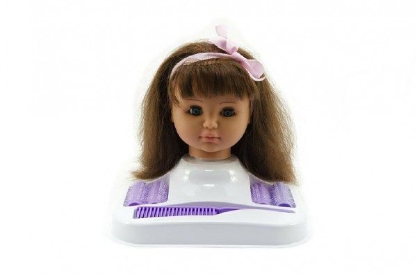 Na česací hlavě s hnědými vlasy si bude moci každá malá budoucí kadeřnice vyzkoušet libovoný účes. K česací hlavě jsou také doplňky.