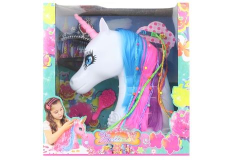 Česací hlava jednorožce o rozměrech cca 22 x 27 cm. Součástí balení je hřebec, korunka a 6 barevných copánků. Rozměry balení cca 30,5 x 32 x 14 cm. Věk 3+