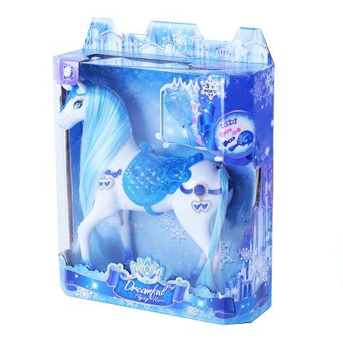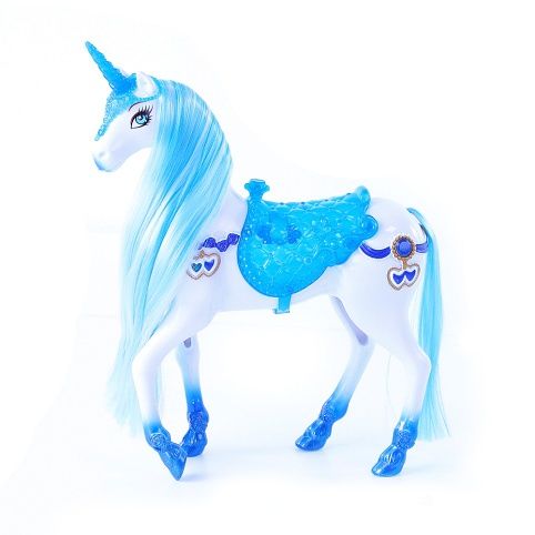 Modro-bílý kůň se stane klenotem ve stáji tvých panenek! Koník tě uchvátí svým stylovým sedlem, ale hlavně překrásnou hřívou, kterou můžeš upravovat přiloženým hřebínkem a doplňky. Stisknutím tlačítka vydává zvuky a bliká korunka a sedlo. Vyžaduje 3 ks baterií AG13, které jsou součástí balení.