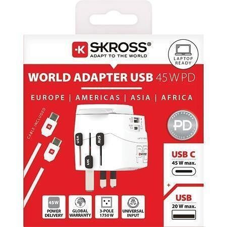 Cestovní adaptér, bílá, 1x USB-A / 1x USB-C PD, 45W, kabel USB-C, SKROSS 1.302474