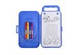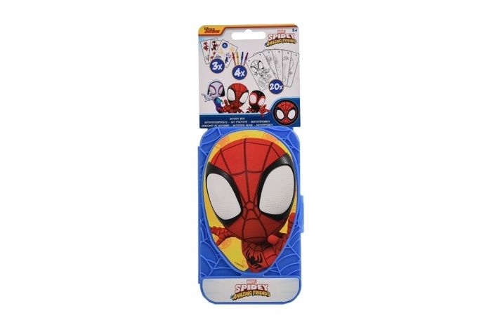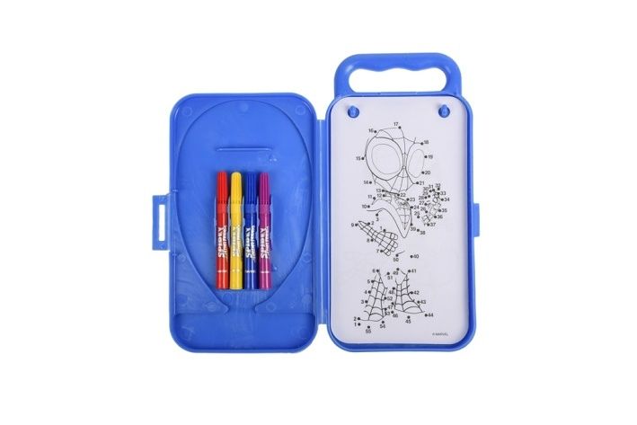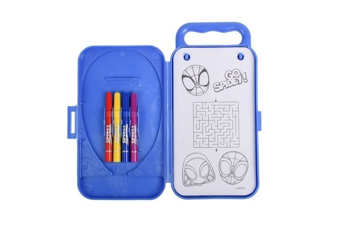 Cestovaní malovací sada Spidy obsahuje – plastovou krabičku s ouškem, 3 aršíky se samolepkami, 20 kartiček s různými aktivitami, 4 ks fixů.