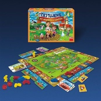 Hra Cestujeme po hradech a zámcích. Balení obsahuje 1 herní plán, 12 dřevěných figurek, 48 karet hradů a zámků, 44 akčních karet, 2 bodové hrací kostky, 104 bankovek a 1 pravidla. Hraje určena pro 2 - 4 hráče. Vhodné od 7 let.