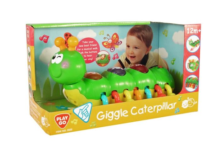 Má otočnou hlavu, která se při chůzi otáčí a cvaká. Chodit s tebou může všude, protože má pod hlavou tahací šňůru. Na zadečku je ovládání hlasitosti a na tělíčku jsou tři tlačítka na stlačení. Při zmáčknutí tlačítek začne housenka hrát zvukové efekty a melodie. – Rozměry balení: 22 × 13 × 11 cm.