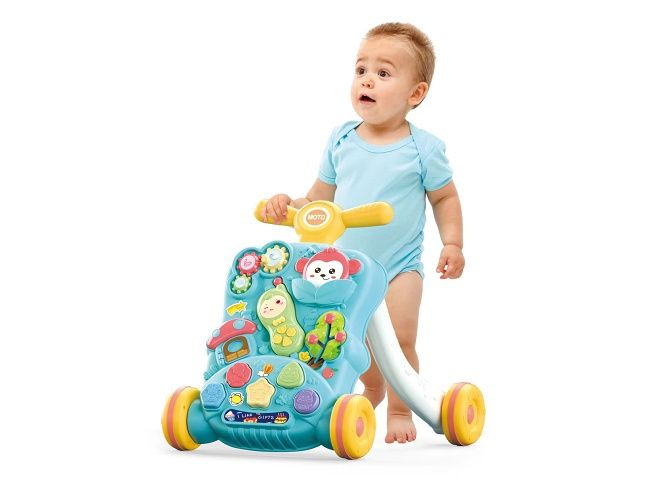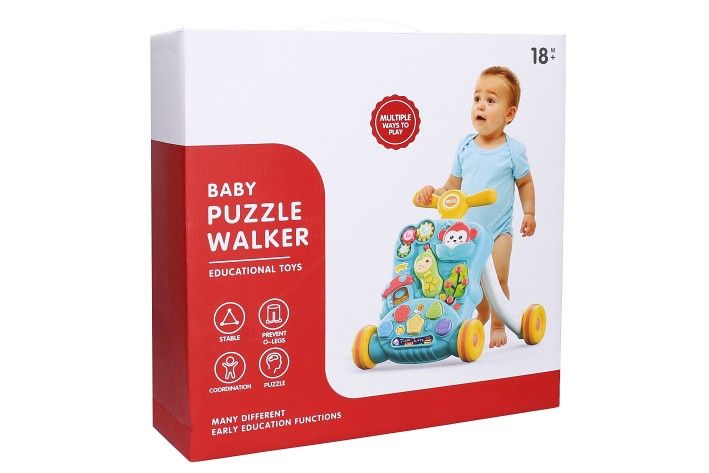Chodítko interaktivní. Návod na složení na obalu. Baterie 2x AAA (1. 5V) nejsou součástí balení. Nastavitelná výška madla, nastavení odporu koleček pro regulaci rychlosti chůze. Vydává zvukové efekty. 2 varianty - modrá, červená.