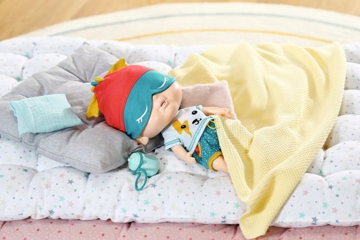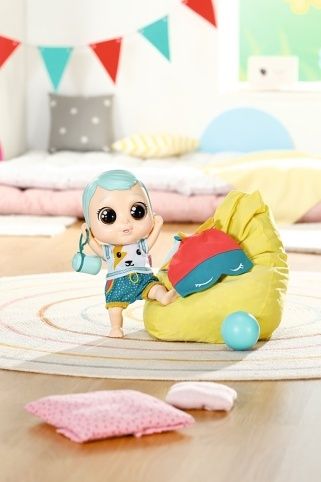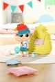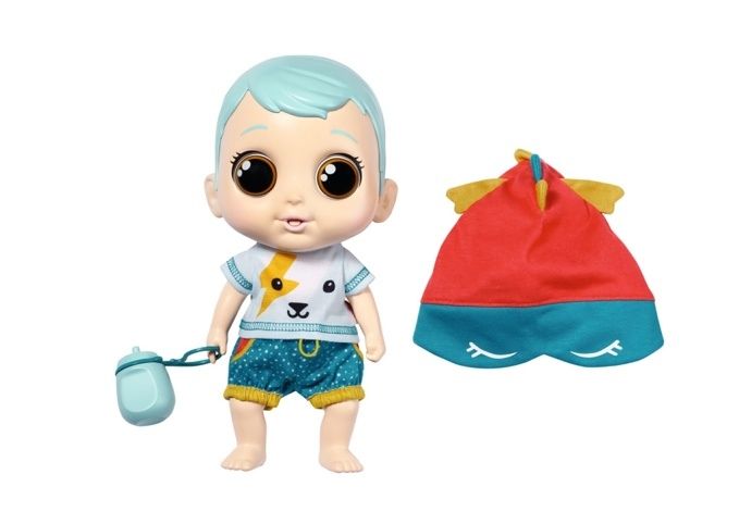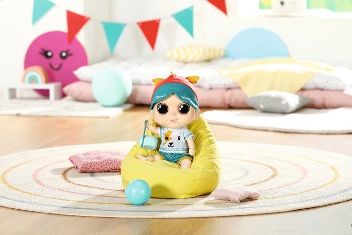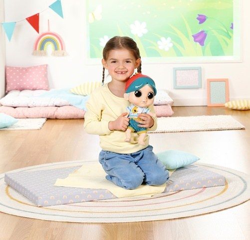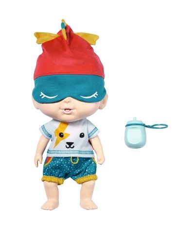 Podívej, teď zahýbala očima!“ Malý neposeda čas od času zakoulí pohyblivýma očima – třeba když se mu něco nezdá. Většinou má ale 30 cm velká panenka dobrou náladu a nadšeně se chichotá, když ji třeba vyhodíte do vzduchu a pak zase chytíte. Po hraní je spokojená, ale také trochu unavená. Pokud je jemně kolébána ke spánku, zívá a usíná se zvuky spánku. Roztomilá čepička slouží jako maska na spaní. Panenka si s sebou do nového domova přináší lahvičku a dudlík, který ráda nahlas cumlá. Panenka s modrými vlásky nosí modré tričko s potiskem pejska a tyrkysové kalhoty s legračními tečkami. Součástí limitované edice je také tyrkysové pyžamko ve stylu pejska. • Originální panenka CHOU CHOU. • Ve stylu kreslených panenek. • Velikost 30 cm. • S velkýma pohyblivýma očima. • S roztomilými funkcemi a zábavnými zvuky. • Funguje na baterie (nejsou součástí balení). CHOU CHO Baby Mika, limitovaná edice, je panenka velikosti 30 cm. Na sobě má tričko, kalhoty a čepičku. Součástí je lahvička a dudlík. V limitované edici je také pyžamko. Na baterie: 3x AAA (nejsou součástí balení)