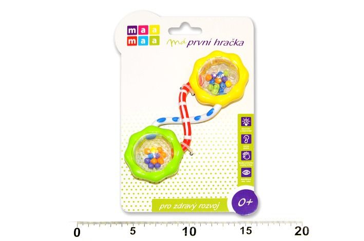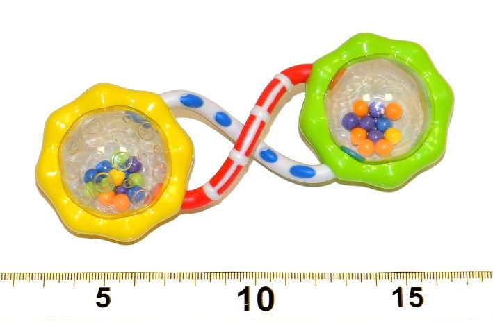 Chrastítko je ve tvaru zajímavé činky. Na obou koncích jsou koule plné menšími pestrobarevnými kuličkami, díky kterým hračka krásně chrastí. 14x5cm