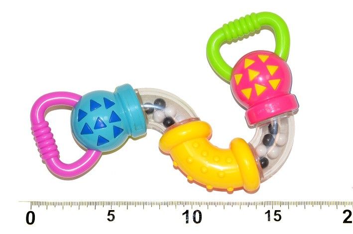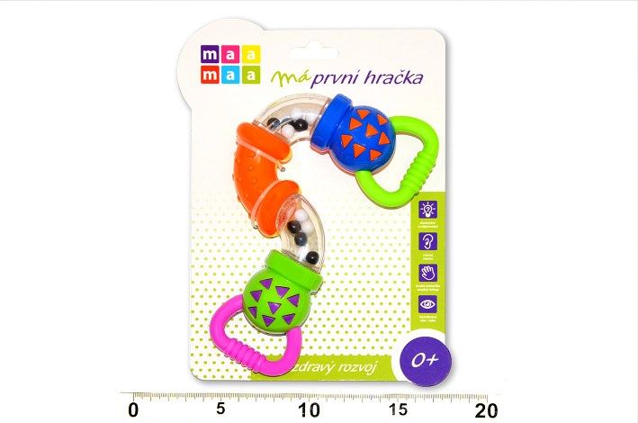Chrastítko se skládá z různobarevných trubiček, které se dají otáčet. Při otáčení vzniká chrastivý zvuk. Hrkávka hrká také díky kuličkám, kterými je naplněna. Hračka má pohodlné úchyty. Velikost: 17x11cm