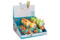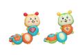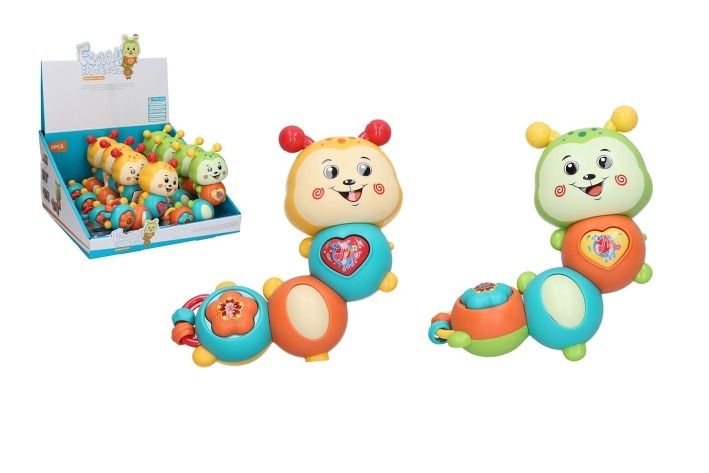 Chrastítko housenka s efekty. Velikost 14 cm. Vydává světelná a zvukové efekty (melodie). Pískací tlačítko, váleček. Display box 8 ks. 2 varianty - žlutá, zelená. Baterie 2xAAA nejsou součástí.