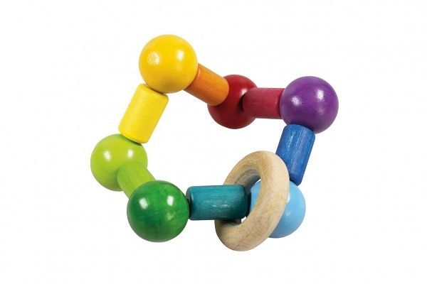 K procvičování jemné motoriky rukou a prstíků nejmenších skvěle poslouží hračka z barevných dřevěných dílků navlečených na gumě, které se pohybují, točí a ohýbají.