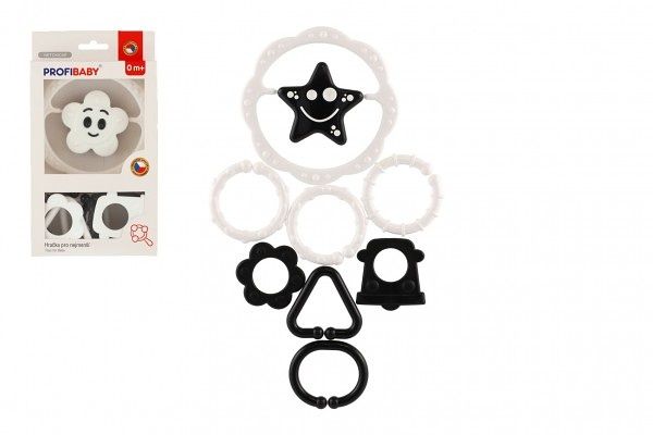 Chrastítko hvězdička/kytička + kroužky černobílé plast v krabičce 12,5x23x3cm 0m+