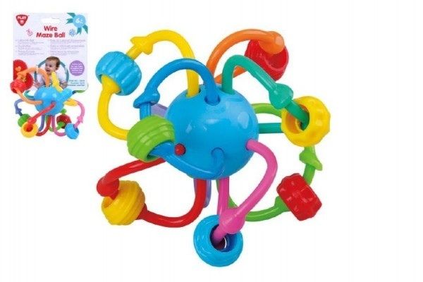 Chrastítko zaujme nejmenší svým tvarem a pestrými barvami. Zamotaný míček obsahuje různé tvary, se kterými se děti procvičí jemnou motoriku, plast.