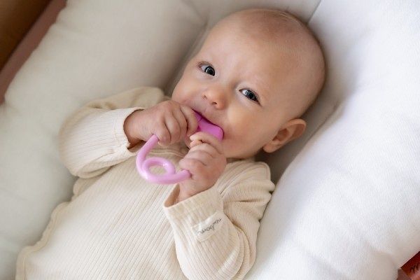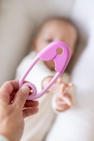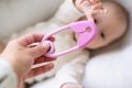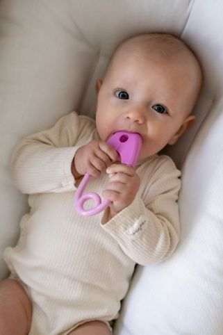 Chrastítko špendlík plast 12cm růžové 12x19cm v sáčku 0+