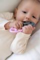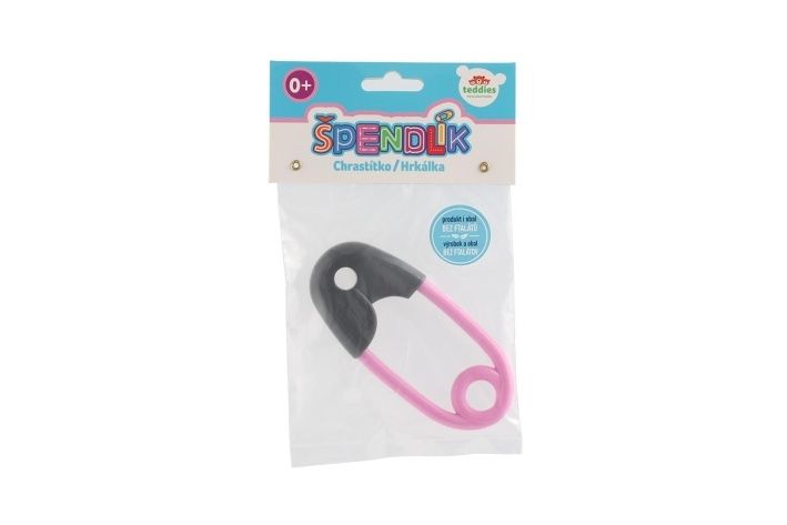 Chrastítko špendlík plast 12cm šedorůžové 12x19cm v sáčku 0+
