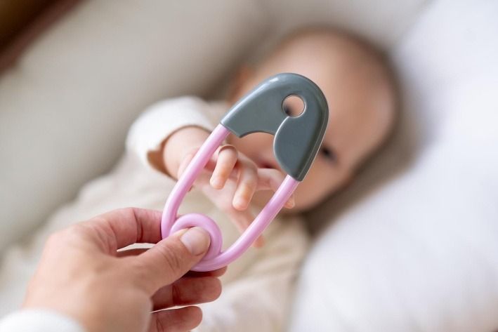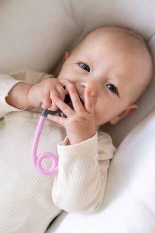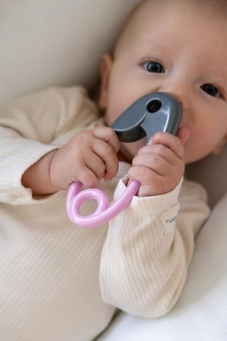 Chrastítko špendlík plast 12cm šedorůžové 12x19cm v sáčku 0+