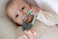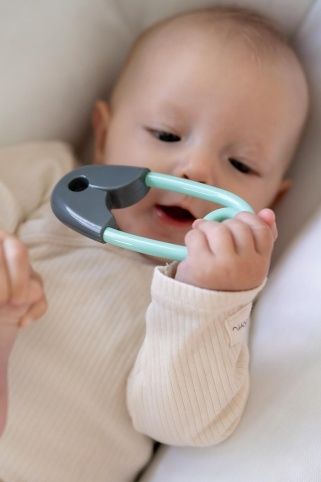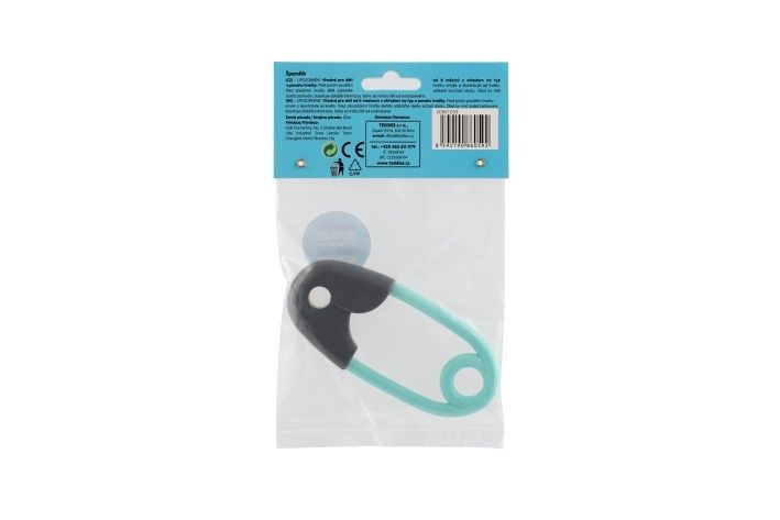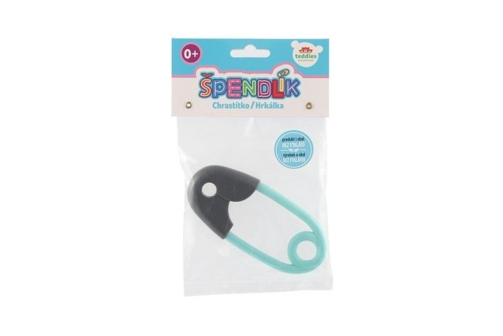 Chrastítko špendlík plast 12cm šedotyrkysové 12x19cm v sáčku 0+