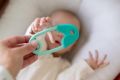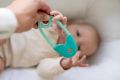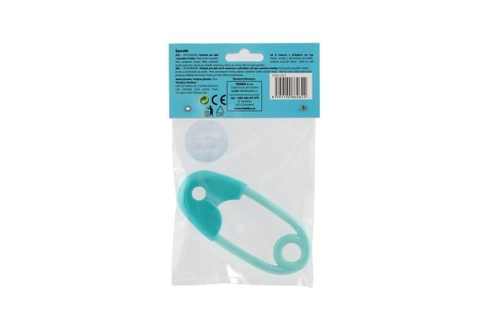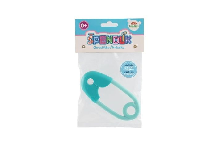 Chrastítko špendlík plast 12cm tyrkysové 12x19cm v sáčku 0+