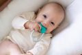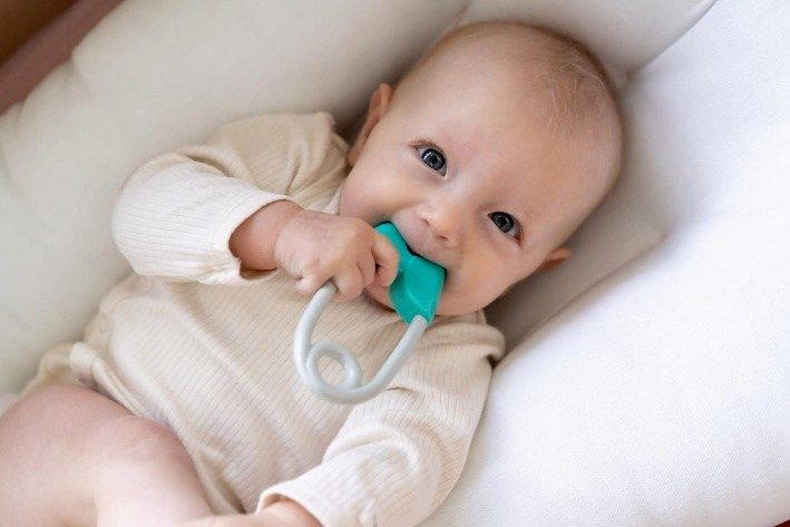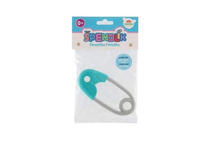 Chrastítko špendlík plast 12cm tyrkysovošedé 12x19cm v sáčku 0+