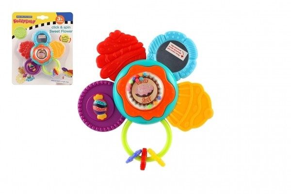 Veselé dětské chrastítko a kousátko ve tvaru květiny. Přísavkou připevněte hračku například na stůl. Dítě tak může otáčet o 360°C se zvukem "klikání". Na Chrastítku nalezlnete zrcátko pro zábavu, kroužky na dotyk, kousátko na žvýkání a upřostřed po zmáčknutí píská.