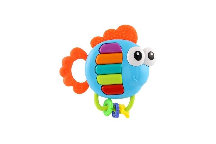 Chrastítko ve tvaru rybky je díky svým veselým barvám a tvaru u dětí velmi oblíbené. Chrastítko po zmáčknutí kláves hraje melodie a tóny jednotlivých kláves. Při hře klávesy svítí. Na zadní straně je možné nastavit zvuky melodií nebo tóny. Je vyrobeno z plastu a lze jej tak snadno omýt. Je na baterie 2x1,5V (AAA), které jsou součástí, na zadní straně je pojistka, kterou je potřeba před hraním vyjmout. Rozměr chrastítka: 14 x 14 cm. Vhodné pro děti od 3 měsíců