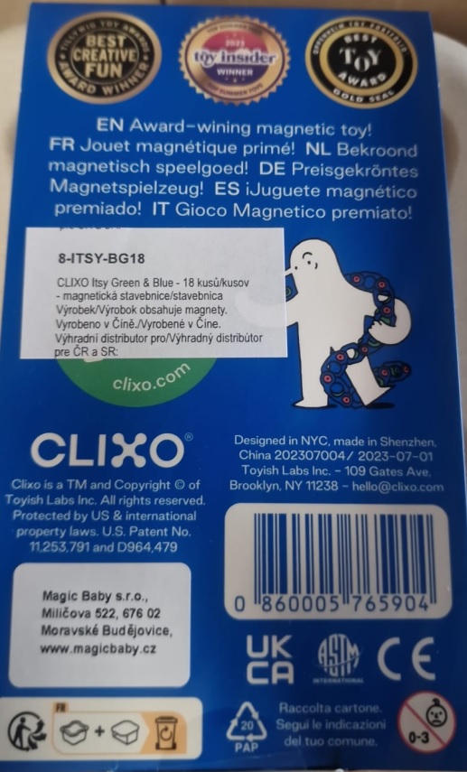CLIXO Itsy Green & Blue - 18 kusů je flexibilní, velmi lehká, magnetická stavebnice ze syntetického papíru, v zelené a modré kombinaci, která je inspirována origami a zároveň je to skvělá Montessori hračka. Tato stavebnice je založena na principu spojování různých tvarů a dílků přichycením červených a modrých magnetů k sobě. Sada Itsy obsahující různé tvary umožňuje stavět takové kombinace, jako je kytička i se stonkem, myška s ocáskem nebo letadlo, které je možné následně i zavěsit plus mnohé další stavby podle vlastní fantazie. Inspirace pro různé stavby naleznete na papírovém balení, jež tvoří obal výrobku. V tomto zázračném balení kapesní velikosti se skrývá svět zábavných objevů! Tato sada se skvěle hodí i jako doplněk k jakékoliv jiné sadě. Prodává se ve dvou barevných variantách.Charakteristika sady: • Počet tvarů: 6 • Počet kusů: 18 (ve 2 barvách)• Rozměr balení: 16,5 x 16,5 x 6,5 cm • Váha balení: 150 gramů• Rozměry prvků: cca 10 x 10 cm• Doporučený věk: 4-7Hlavní vlastnosti stavebnice CLIXO:• Vysoce kvalitní, ekologické dílky pro dlouhé hodiny hraní• Vysoká flexibilita prvků• Voděodolné díly díky použití kvalitního syntetického papíru, které umožňují hraní i ve vodě• Velmi silné magnety (prvky přitahující se z velké vzdálenosti i několika cm)• Lehké a kompaktní, ideální pro tvoření doma i na cestách• Nespočet výtvorů z hrstky dílků, jednoduše poskládejte a sbalte• Bezplatný přístup na YouTube k dalším stavbám, tipům a trikům• Brožura s kreativními návrhy pro vytváře