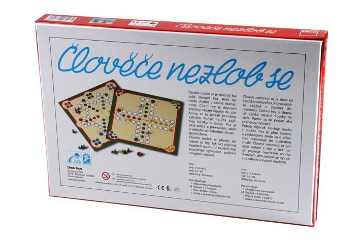 Člověče nezlob se je hra, kterou zná už několik generací, avšak stále si u ní všichni dobře pobaví. Úkolem každého hráče je projít se svými figurkami po směru šipky na herním plánu celou cestu až na cílová pole, tj. na 4 stejnobarevná pole ve středu herního plánu. Rychlost pohybu určuje počet hozených ok na hrací kostce. Ten, kdo se dostane jako první se všemi figurkami do „domečku“, vyhrává! **Obsahuje: 1 oboustranný herní plán, 24 figurek v 6 barvách, 1 hrací kostka, návod CZ+SK. Počet hráčů: 2 – 4 Dnes již klasická desková hra, která nemůže chybět v žádné domácnosti.