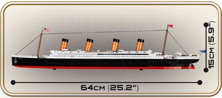 Postavte si unikátní model britského zaoceánského parníku Titanik, který byl vytvořen v roce 1911. Titanik byl jedním ze tří parníků typu Olympic, dalšími byli Olympic a Gigantic. Model je v měřítku 1:450 a sestavený měří 64 x 15 cm. Balení obsahuje 720 kostek stavebnice. Neobsahuje figurky. Na spodní straně lodi jsou kolečka, která umožňují pohyb na pevné podložce.