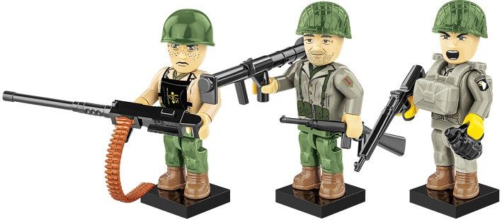 Sada tří figurek znázorňujících americké vojáky vyšla v kolekci připravené u příležitosti 80. výročí vylodění spojenců v Normandii a je označena oficiálním logem organizátorů oficiálních oslav výročí. Mezi figurkami najdeme operátora těžkého kulometu z výsadkového plavidla. Voják z 1. pěší divize (Big Red One) je vybaven puškou M1 Garand a Bazooke! Výsadkář od 101. výsadkové divize je vybaven padákovým batohem, ručním granátem a puškou M1. Tato sada je perfektním doplňkem k soupravám Historical Collection z 2. světové války a novinkám ze série D-Day! S jeho pomocí můžete začít plnit vyloďovací plavidlo a pláže Normandie figurkami amerických vojáků! Díky různým sadám s figurkami si rychle postavíte svou blokovou armádu! Figurky a doplňky můžete použít k sestavení scén a dioramat. Podívejte se také na další sady s figurkami! Balení obsahuje 34 kostek.