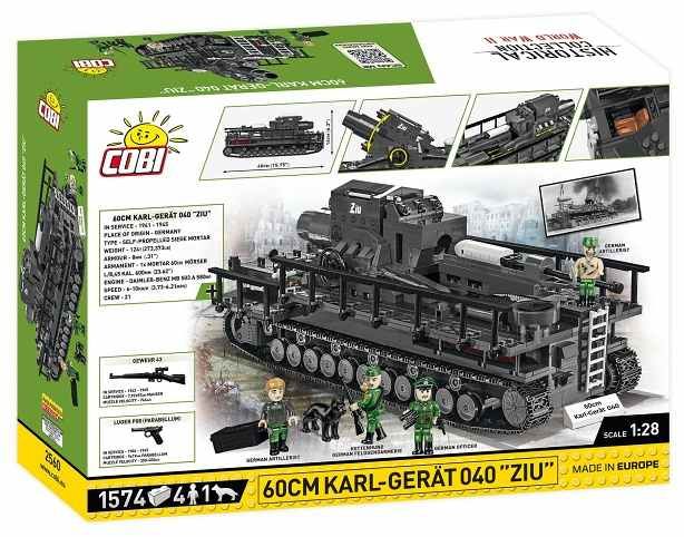 60 cm Karl-Gerät 040 byl nejtěžší samohybný minomet používaný během 2. světové války. Byl vybaven obrovským 60 cm kanónem. Němcům se podařilo vyrobit jen pár exemplářů. Karl Gerät číslo 6 zvaný Ziu byl použit k palbě na Varšavu během varšavského povstání v roce 1944. Model je v měřítku 1:28. Sestavený model měří 40 x 16 x 16 cm. Balení obsahuje 1 574 kostek stavebnice a 5 figurek: 4 figurky německých vojáků a psa polního četnictva.
