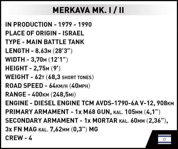 Postavte si tank Merkava, hlavní bojový tank vyvinutý a vyrobený v Izraeli pro Izraelské obranné síly (IOS). Konstrukce tanku Merkava upřednostňuje přežití posádky, motor je umístěn vpředu a slouží tak jako součást balistické ochrany, dveře jsou v zadní části tanku. Díky silnému pancéřování a vysoké mobilitě je to jeden z nejlépe chráněných tanků na světě. Tento model Merkavy se vyráběl v letech 1979 - 1990 a posádku tvořili 4 vojáci. Náš model vznikl ve spolupráci s Deutsches Panzermuseum Munster a je v měřítku 1:35. Balení obsahuje 825 kostek, neobsahuje figurky.