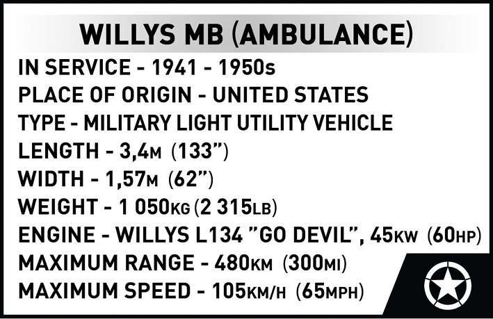 Postavtesi model Jeep Willys MB legendární terénní vůz, který hrál klíčovou roli během druhé světové války. Vyráběla ho americká společnost Willys-Overland Motors a byla součástí vojenského programu na poskytování vozidel pro armádu Spojených států a její spojence. Willys MB se vyznačoval jednoduchou konstrukcí, solidností a spolehlivostí v náročných polních podmínkách. Jeho kompaktní rozměry, odolnost a schopnost navigace v obtížném terénu z něj udělaly legendu v automobilové historii. Po válce obliba Jeepu Willys MB přispěla k rozvoji značky Jeep a stala se inspirací pro pozdější modely terénních vozů. Jeep Willys MB dnes oceňují sběratelé a milovníci vojenských předmětů a automobilové klasiky. Balení obsahuje 1131 kostek.
