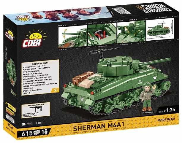 Tank Sherman byl pečlivě navržen v měřítku 1:35 s použitím 615 kostek stavebnice. Tank má funkční pásovou trakci, otočnou věž, pohyblivou hlaveň, otevírací poklop a servisní poklop, pod nímž najdete maketu motoru. Sada obsahuje figurku amerického tankisty se sluchátkem a samopalem M3 "Grease gun". Kostky stavebnice mají vysoce kvalitní potisky, které věrně odrážejí označení a detaily tanku i detaily uniformy velitele tanku. Sestavený model tanku měří 17 x 11,5 cm.