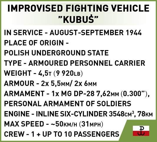 Postavte si model Kubuś, polský improvizovaný obrněný vůz, který postavili varšavští povstalci v srpnu 1944 během Varšavského povstání. Toto vozidlo bylo postaveno během několika dní v dílně na ul. Tamka. Byl postaven pomocí podvozku nákladního vozu Chevrolet 157 a ocelových plechů, které měly posádku chránit před nepřátelskou palbou. Kubuś, vyzbrojený kulomety, se zúčastnil několika bojových operací, včetně neúspěšného útoku na Varšavskou univerzitu. Po skončení povstání Kubuś jako zázrakem přežil válku a v současnosti je vystaven v Polském armádním muzeu ve Varšavě jako symbol odvahy a vynalézavosti varšavských povstalců! Balení obsahuje 302 kostek a 2 figurky.