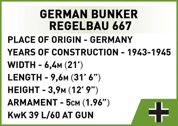 Postavte si model Regelbau 667 byl navržen tak, aby chránil německé jednotky před očekávanou invazí spojenců. Jeho hlavním účelem bylo poskytnout útočiště a bezpečnost nejen vojákům, ale také cennému vojenskému vybavení, které bylo nezbytné k provádění nepřátelství. Balení obsahuje 642 kostek a 2 figurky.