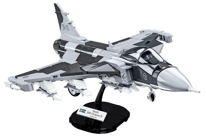 JAS 39 Gripen E je nejmodernější vývojová verze populárních švédských víceúčelových stíhaček, vyráběných leteckou společností SAAB. Název letounu Gripen znamená gryf a zdůrazňuje víceúčelovost letounu. Zkratka JAS vznikla ze švédských slov: Jakt - lov, Attack - přepadení, Spaning - průzkum. Gripen je vysoce výkonný, víceúčelový stroj, který je schopen plnit všechny tyto úkoly. Konfigurace kachny a křídla v konfiguraci delta umožňují vyvinout vysoké rychlosti. Verze „E“ je vyvíjena pro potřeby švédského a brazilského letectva. Letadlo se mírně prodloužilo, zvětšilo se i rozpětí křídel a hmotnost. Konstruktéři informují o revolučních změnách v avionice, nárůstu výkonu motoru o 22 procent a doletu prodlouženém na 4075 km. Modernizován byl i pilotní kokpit. JAS-39 Gripen E je stíhačka nabitá nejmodernějšími technologiemi. Pilot chráněný elektronickými senzory a systémy umělé inteligence se může soustředit na misi. Model je v měřítku 1:48 a sestavený měří 31,5 x 20 x 10 cm. Balení obsahuje 480 kostek stavebnice.