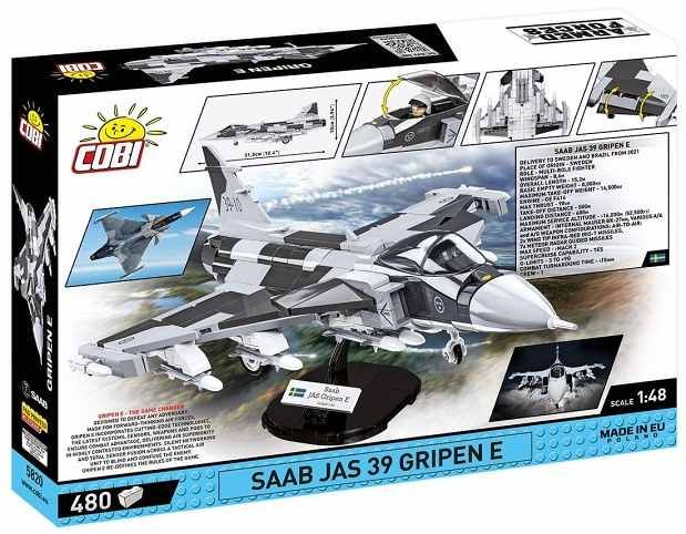 JAS 39 Gripen E je nejmodernější vývojová verze populárních švédských víceúčelových stíhaček, vyráběných leteckou společností SAAB. Název letounu Gripen znamená gryf a zdůrazňuje víceúčelovost letounu. Zkratka JAS vznikla ze švédských slov: Jakt - lov, Attack - přepadení, Spaning - průzkum. Gripen je vysoce výkonný, víceúčelový stroj, který je schopen plnit všechny tyto úkoly. Konfigurace kachny a křídla v konfiguraci delta umožňují vyvinout vysoké rychlosti. Verze „E“ je vyvíjena pro potřeby švédského a brazilského letectva. Letadlo se mírně prodloužilo, zvětšilo se i rozpětí křídel a hmotnost. Konstruktéři informují o revolučních změnách v avionice, nárůstu výkonu motoru o 22 procent a doletu prodlouženém na 4075 km. Modernizován byl i pilotní kokpit. JAS-39 Gripen E je stíhačka nabitá nejmodernějšími technologiemi. Pilot chráněný elektronickými senzory a systémy umělé inteligence se může soustředit na misi. Model je v měřítku 1:48 a sestavený měří 31,5 x 20 x 10 cm. Balení obsahuje 480 kostek stavebnice.