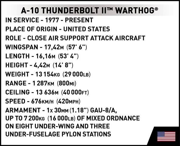 Postavte si model A-10 THUNDERBOLT II™ WARTHOG®. Jedná se o letoun přímé palebné podpory ve výzbroji amerického letectva. Jednomístný útočný letoun, odolný proti poškození, poháněný dvěma turbodmychadlovými motory, je určen k ničení tanků, obrněných vozidel a dalších pozemních cílů. V letech 1975 až 1984 bylo vyrobeno 715 exemplářů tohoto stroje. K bojovému použití došlo mj. v Kosovu, Afghánistánu a během války v Perském zálivu. Balení obsahuje 667 kostek stavebnice. Neobsahuje figurky. Model je v měřítku 1:48.