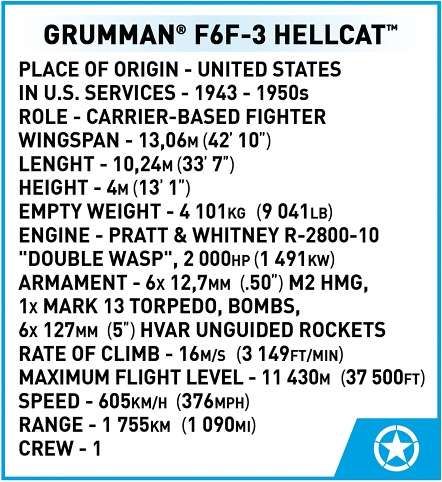 Postavte si model F6F Hellcat byl navržen jako odpověď na japonské stíhačky Mitsubishi A6M Zero. Vyznačoval se pevnou konstrukcí, vysokou palebnou silou a snadnou pilotáží, díky čemuž byl mimořádně účinný v boji. Toto letadlo hrálo klíčovou roli v bitvě o Midway, bitvě u Leyte a mnoha dalších kampaních v Pacifiku. Byl jedním z hlavních faktorů nadvlády amerického letectví nad japonským letectvím. Balení obsahuje 235 kostek.
