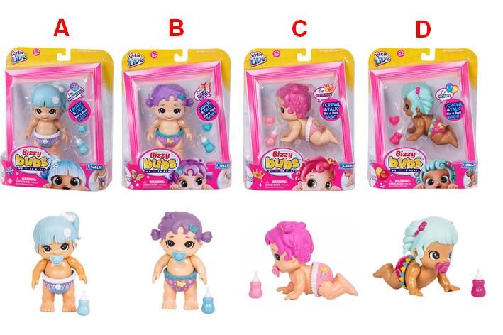 Tahle roztomilá miminka nemají čas na spaní! Jsou plná života a už se nemohou dočkat, až si spolu pohrajete a předevedou Vám, co dovedou! Stiskni tlačítko na plence a miminko na tebe zareaguje. Mluví legrační miminkovskou řečí! 4 druhy: Primulka - růžová lezoucí, Makulenka - modrá lezoucí, Sněženka - stojící modrá, Květuška - stojící fialová. Balení obsahuje: 1 miminko, 1 lahvička, 1 dudlík, návod, 4 baterie LR44.