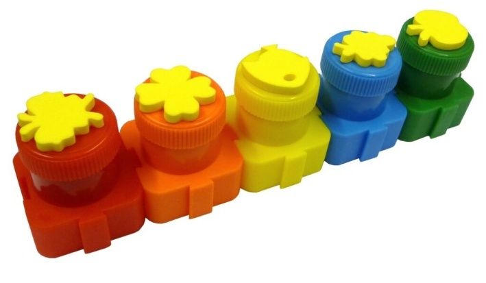 Na každém víčku razítko různých tvarů. Skvělá zábava pro nejmenší malíře. Snadné nanášení barev přímo prsty. Na každém víčku je umístěno razítko s jiným motivem pro vytvoření obrázku.
