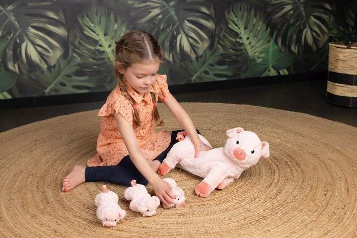 Rozkošná plyšová souprava skládající se z maminky a 3 jejich zrovna narozených miminek. Maminka je navržená tak, že její bříško má ve spodní části uzavíratelný zip, ve kterém jsou miminka před narozením schovaná. Tato důmyslný kapsa, je velmi praktická na cesty. Mláďátka tak mohou s maminkou bezpečně cestovat, aniž by se poztrácela. Tato hračka u dětí rozvíjí emoce, pečovatelský cit a učí je zodpovědnosti. Zvířátka jsou vyrobena z velmi měkkého plyše a kvalitní látky. Velikost maminky 50 x 30 x 17 cm váha 250 g, velikost 1 mláďátka 13 x 5 x 7 cm váha 30 g. V nabídce jsou i sady s dalšími motivy.