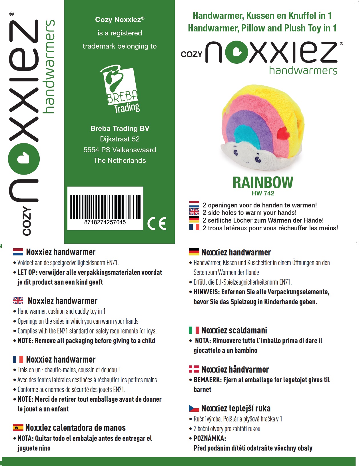 Měkoučký polštář, rukávník na ohřátí rukou nebo věrný kamarád plyšák? To vše najdete v jednom. Tento nápaditý polštář se zvířátkem se stane velmi rychle nejlepším kamarádem každého dítěte. Navíc je pro děti opravdu ideálním společníkem na cestách v autě, letadle, vlaku, ale i krásným dekoračním doplňkem každého dětského pokojíku. Každý polštář z této řady slouží jako ohřívač rukou, protože má po stranách 2 otvory. Stačí jen vložit ruce dovnitř a za chvilku jsou teplé. Navíc zmíněné boční otvory mohou sloužit i jako dokonalá tajná skrýš, kam se dá ledacos schovat, což děti přímo milují. Tato produktová řada nabízí polštáře s mnoha motivy zvířátek a několik i s motivem ovoce, takže každý malý člen rodiny může mít svého oblíbeného mazlíčka. V nabídce Cozy Noxxiez najdete v mnoha případech i obří hřejivý pantofel nebo deku s kapucí a kapsami s motivem stejného zvířátka a můžete mít tak celou zahřívací sadu ve stejném designu. V roce 2023 přibyly v nabídce, jako úplná novinka, i televizní mikinové deky pro děti ve věku 3 - 6 let a 7 - 12 let, které také tematicky patří k některým kolekcím. Stručný popis a doplňující informace:• Super měkký a příjemný materiál• Slouží jako rukávník k ohřívání rukou (po stranách jsou dva otvory)• Ideální pro cestování• Velikost 35 cm x 35 cm x 35 cm • Materiál: 100% polyester• Ruční praní, sušit vyvěšením• Věk: certifikováno od 0 měsíců• Navrženo v Nizozemí